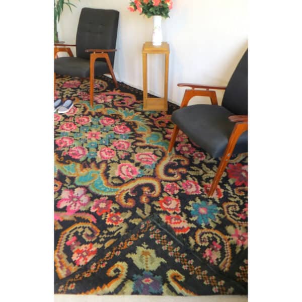 Cette pièce est un tapis traditionnel moldave, tissé à la main en laine naturelle. Bien que vintage, il a été nettoyé et restauré professionnellement. Vous avez la garantie d’acheter un tapis de qualité.